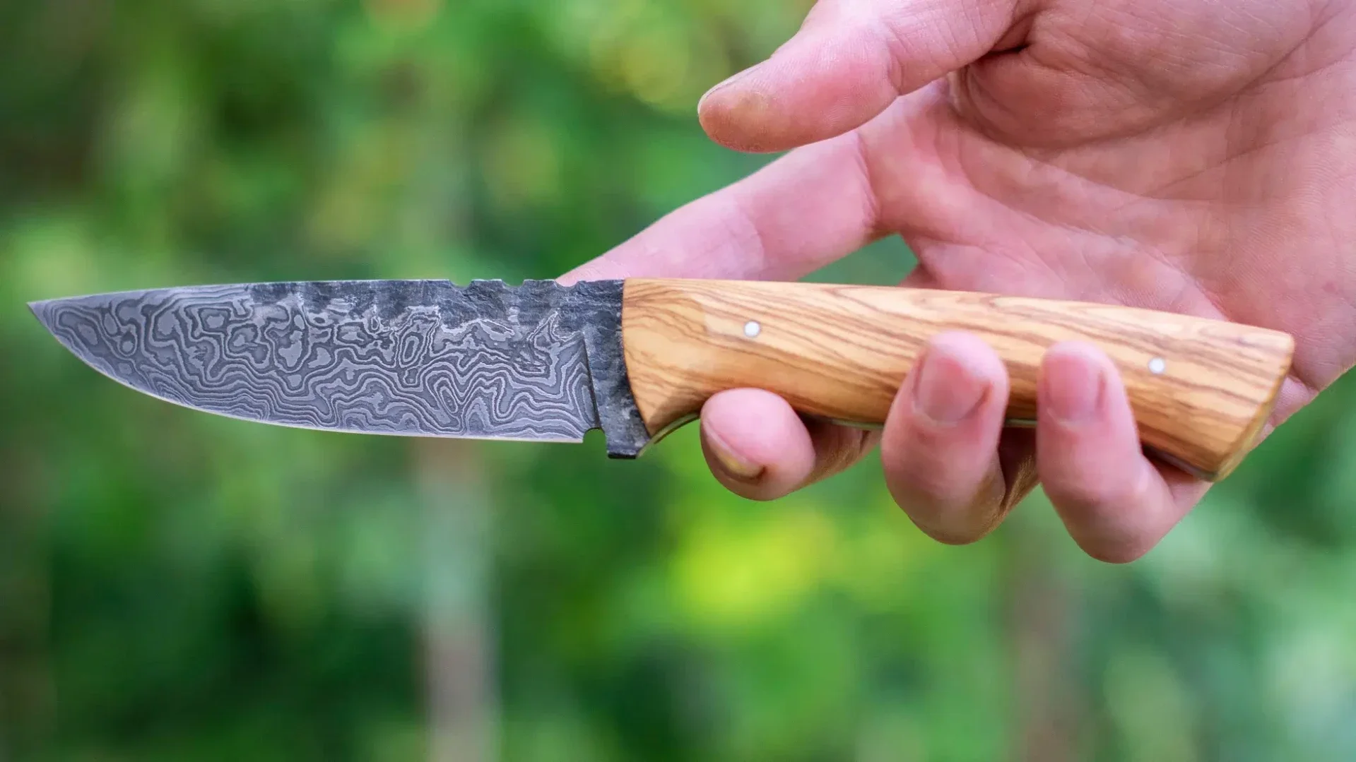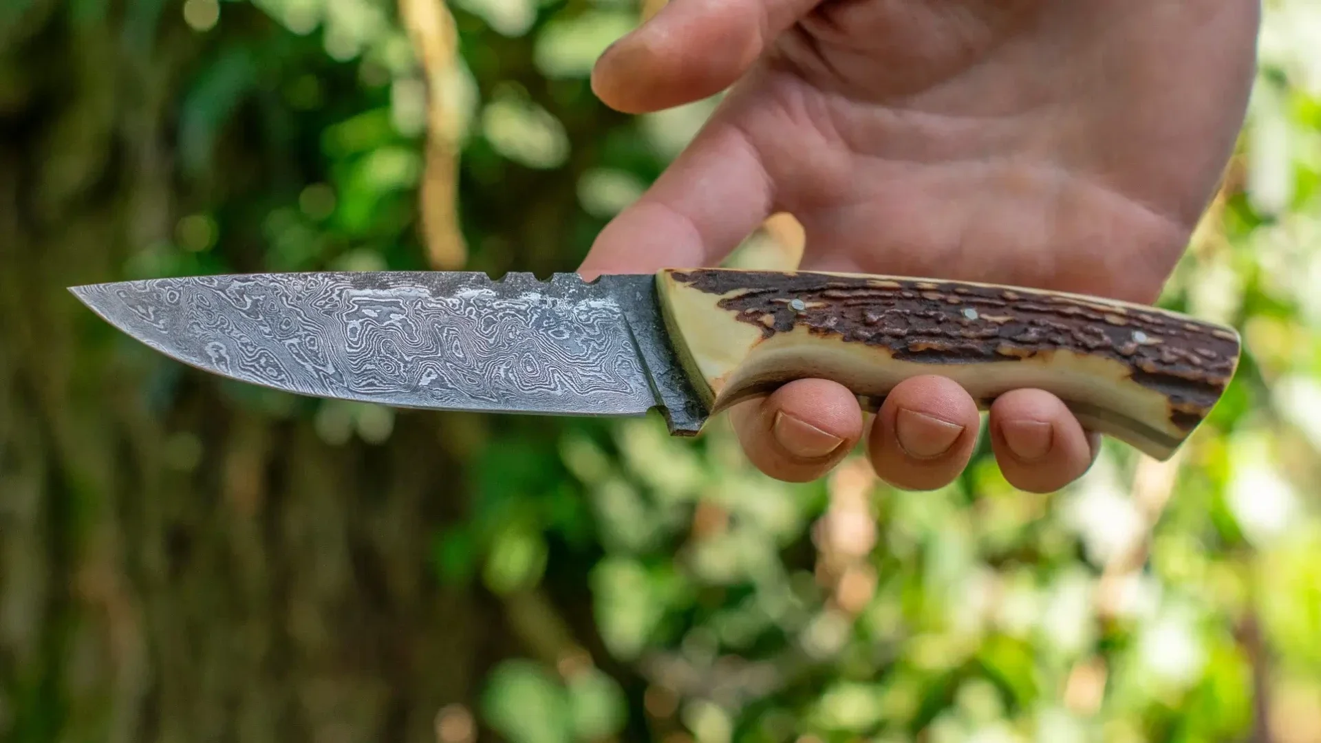 Die individuellen Griffe bestehen aus echtem heimischem Hirschhorn oder unterschiedlichen Hölzern und sind durch drei stabile Stiftnieten fest mit der Klinge verbunden.